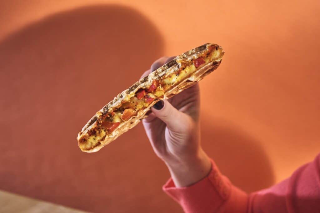 La gaufre salée César : un grand classique revisité : du poulet, du fromage fouetté avec une pointe d’ail, du grana padano, de la roquette et une sauce tomate unique développée par l’enseigne.