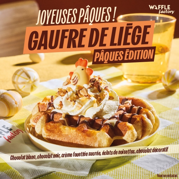 - du 1er au 14 avril, la gaufre de Liège Pâques Edition saura ravir les gourmands avec son mélange de chocolat blanc et de chocolat noir, sa crème fouettée sucrée, sa touche de noisette ainsi que sa décoration saisonnière.
