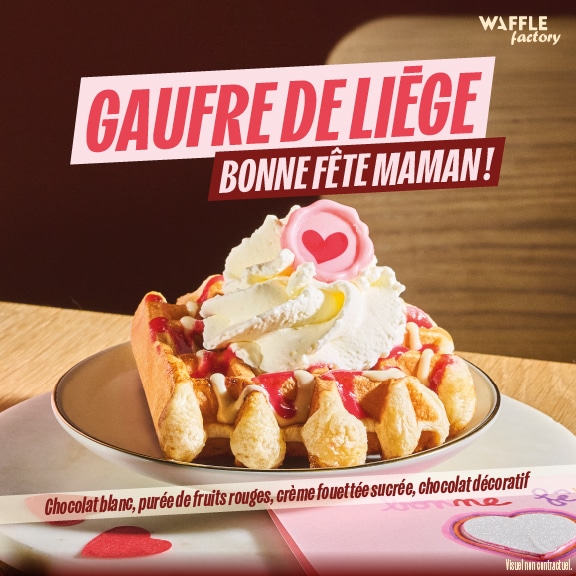 - Du 20 mai au 2 juin, la gaufre de Liège Fête des Mère viendra apporter un peu de douceur avec son chocolat blanc, sa purée de fruits rouges, sa crème fouettée sucrée, le tout surmonté d’une décoration en chocolat.